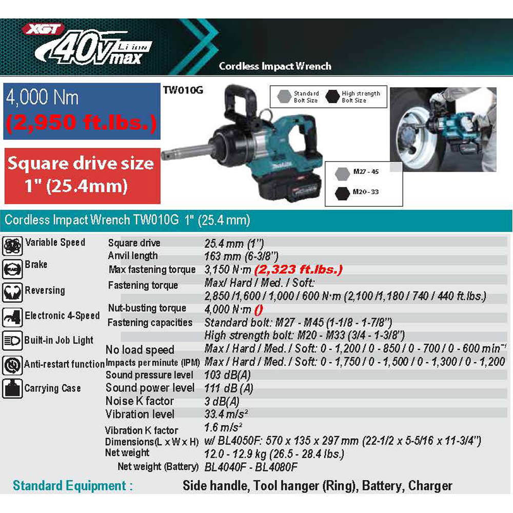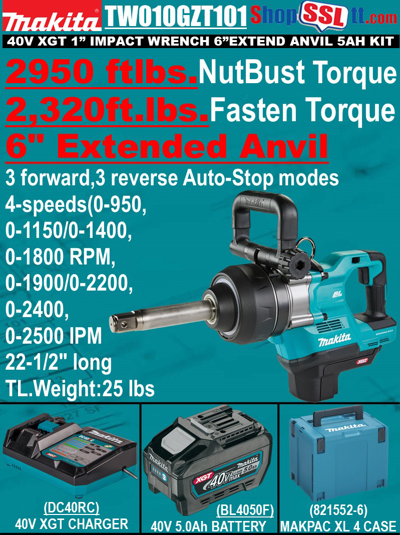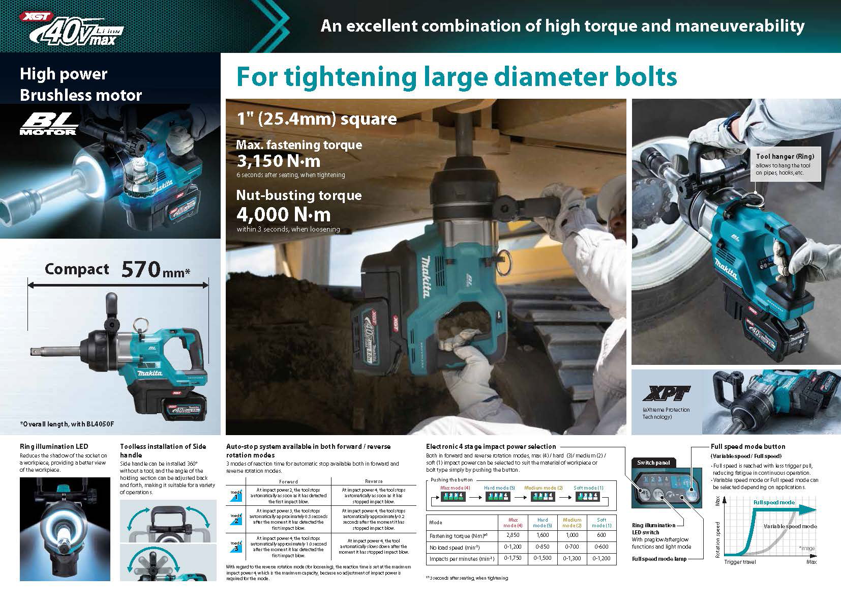 POWER : Makita-built motor delivers 2,950 ft.lbs. of Nut-Busting Torque and 2,320 ft.lbs. Fastening Torque