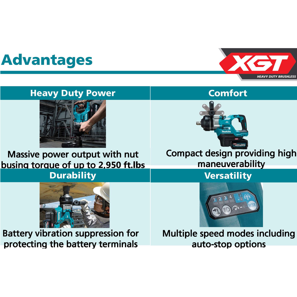 The 40V max XGT® 4-Sp. High-Torque 1" Sq. Drive D-Handle Extended Anvil Impact Wrench kit w/ Friction Ring (TW010G / GWT10) delivers the power of pneumatic impact wrenches for large diameter bolts.